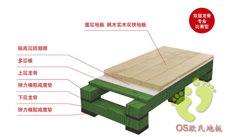 雙層龍骨結(jié)構(gòu)是體育木地板中一種懸浮式木地板結(jié)構(gòu),它不但堅(jiān)固耐用而且彈性十足,運(yùn)動(dòng)性能完全滿足DIN標(biāo)準(zhǔn)的要求。提供出色的彈性而且具備有效的減震功能,地板結(jié)構(gòu)性能比較均勻,滿足用戶對(duì)地板各項(xiàng)性能、外觀和耐久性的要求,該系統(tǒng)擁有**的振動(dòng)吸收,具有空前絕佳的運(yùn)動(dòng)性能,符合所有訓(xùn)練或者體育比賽的要求。