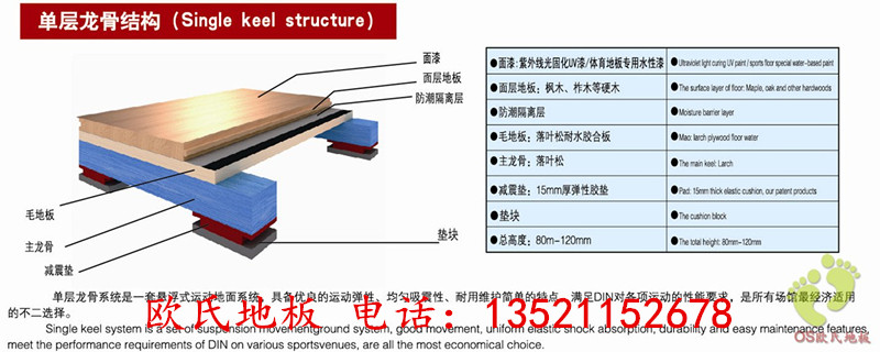 歐氏體育木地板單龍骨結(jié)構(gòu)系統(tǒng)包括以下組件(由底層到面層):