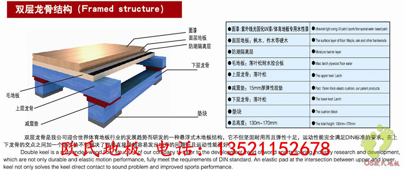 雙龍骨體育木地板系統(tǒng)在上下龍骨的交點(diǎn)之間加一個(gè)彈性墊,有效地解決了龍骨直接接觸容易發(fā)生響聲的問(wèn)題同時(shí)增強(qiáng)了運(yùn)動(dòng)性能,實(shí)木材料作主副龍骨(雙層龍骨)。作為***先進(jìn)的一種全縱向?qū)盈B式抗變形運(yùn)動(dòng)地板結(jié)構(gòu),它大大提高了木方的抗彎抗剪性能,更大大提高了木方的彈性模量。非常適用于籃球、排球等專(zhuān)業(yè)比賽體育場(chǎng)館建設(shè)。