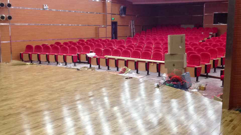 舞臺地板用材,面層為柞木,單層龍骨結(jié)構(gòu),鋪裝面積為103平方米。